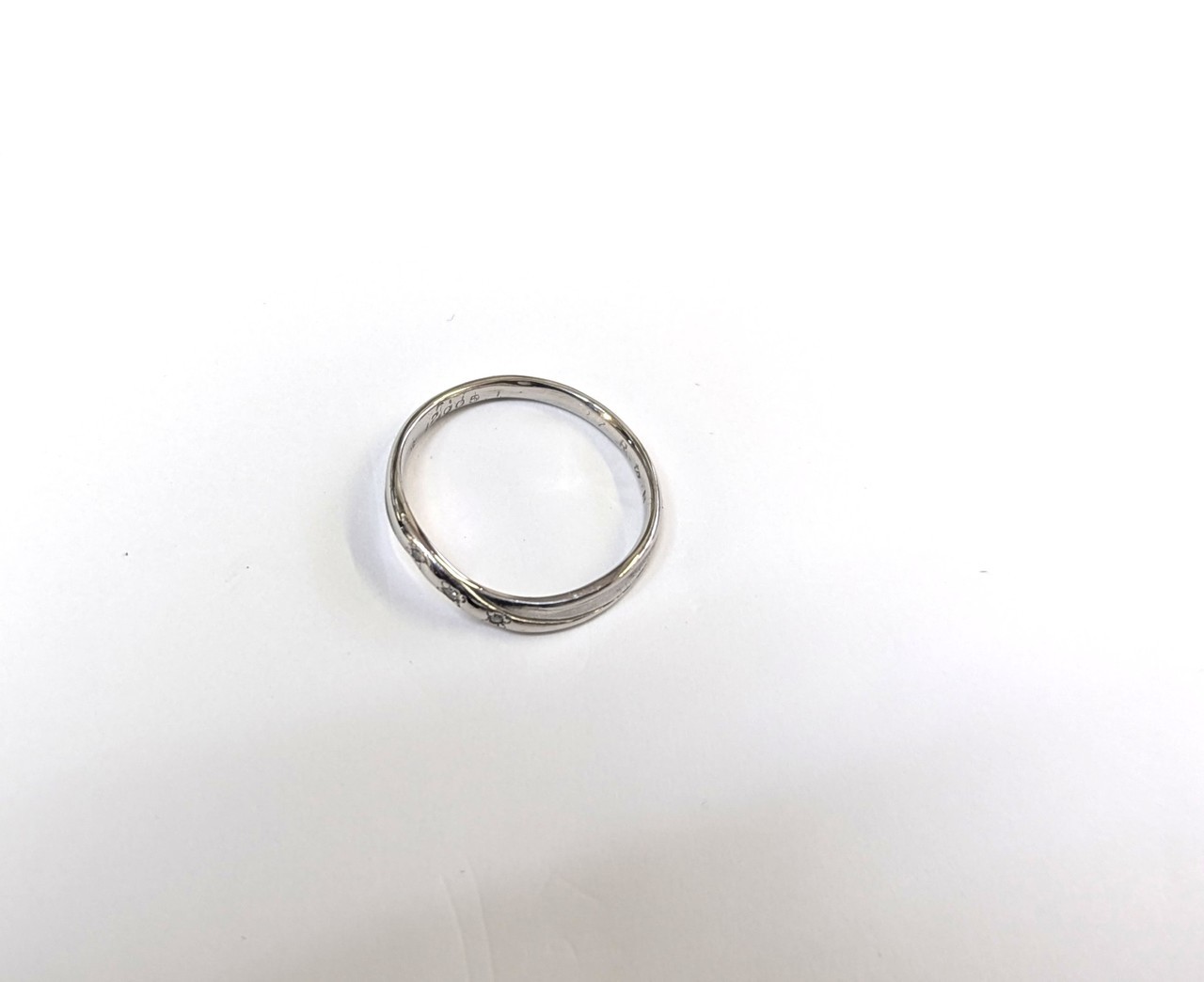 PT900のダイヤリング、0.033~0.35ct位のダイヤが2個取れてしまい、幸い1個は持っているとの依頼でした。