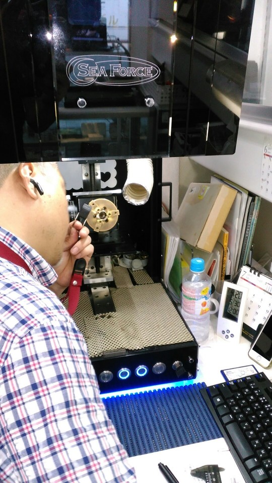 従来の火バーナーによる金属の溶接とは違い、レーザーで溶接加工をしますので、ダイヤモンドやルビー等石留めの付近にも溶接ができるようになり、さらに切断部の溶接仕上がりがとても綺麗で耐久性も高いです。